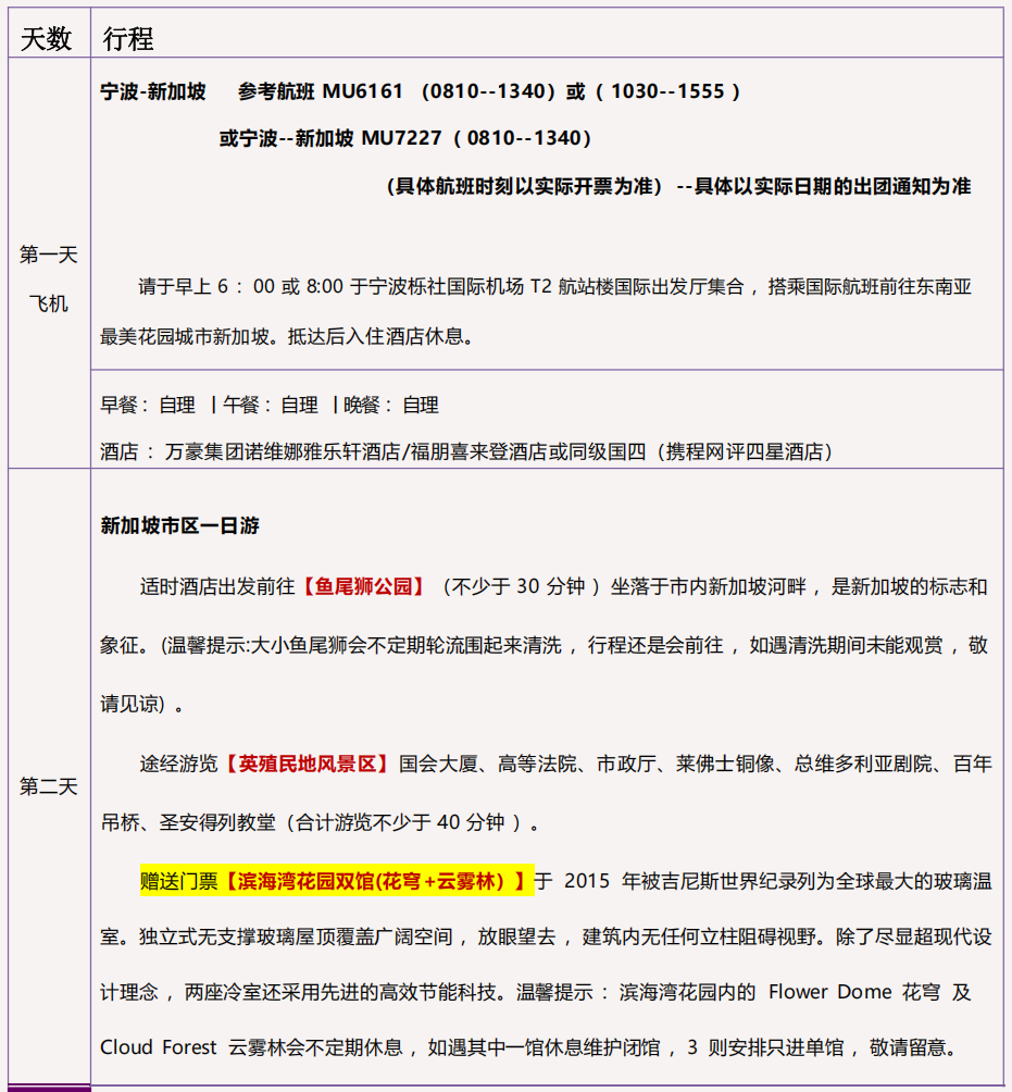 3 )行程内第一道门景点门票 ,园中园门票自理 ;含环球影城、滨海湾花园(花穹+云雾林)、 飞禽一日游