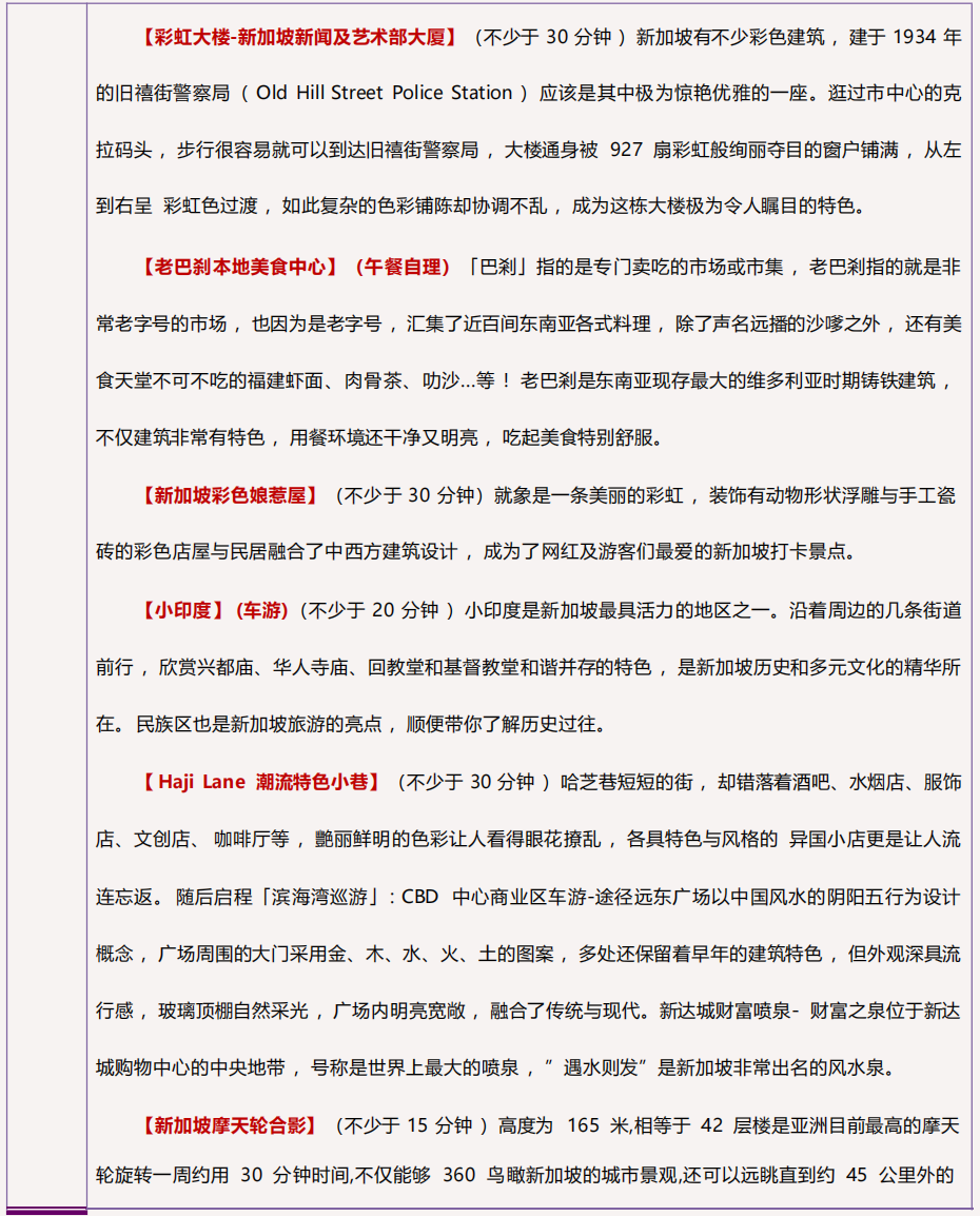 9.游客在新加坡必须随时保持环境卫生,随地吐痰、弃物要被罚款1000新币;在冷气场所及公共场合不可以吸烟,去洗手间记得冲水,否则被认为违法,一旦罪名成立将被罚款500新币;时间:与北京时间一样;