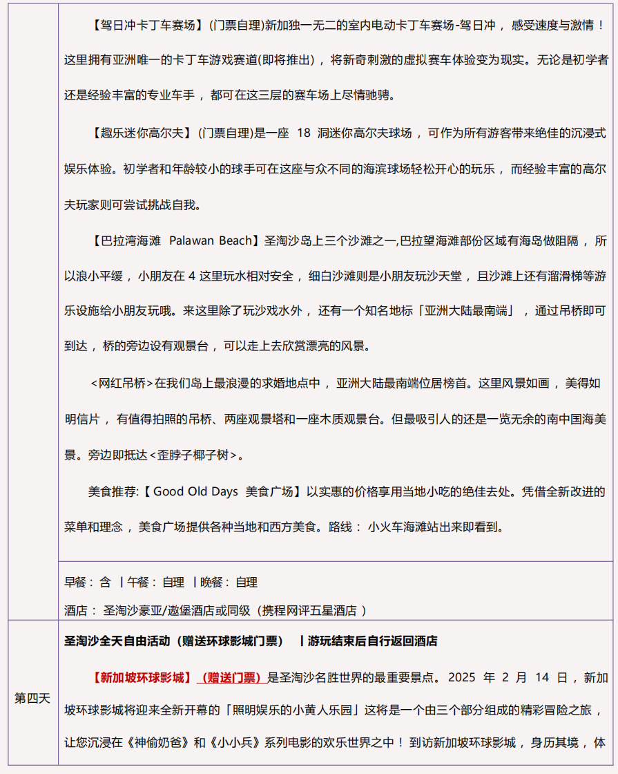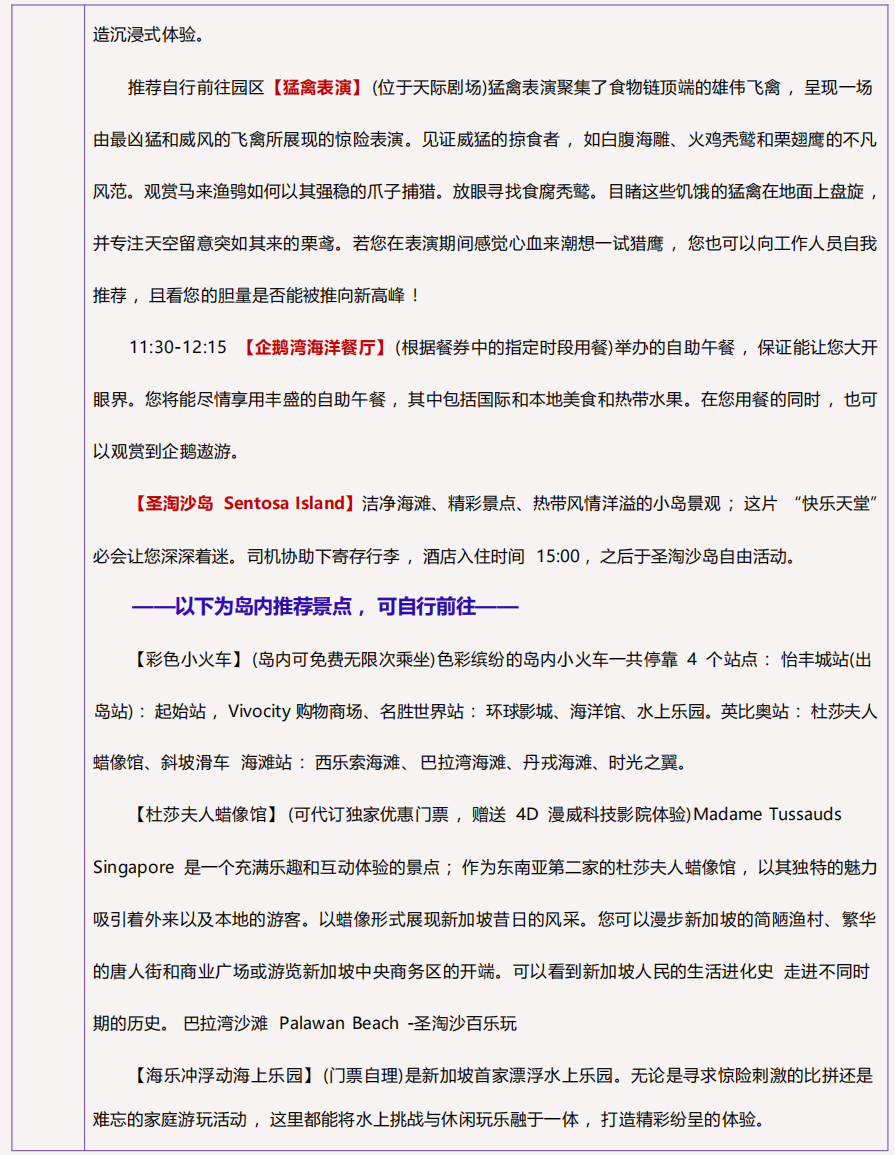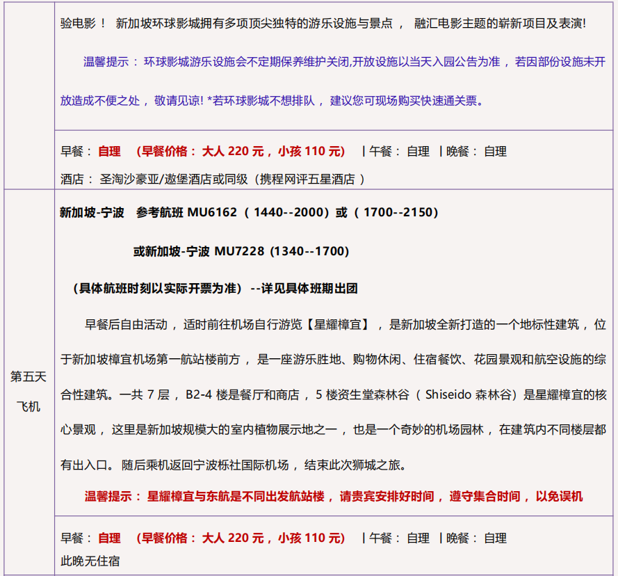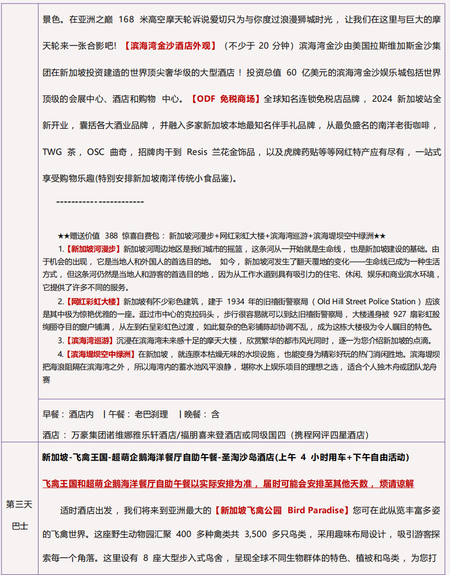 4 ) 用餐 :2 餐酒店早餐(圣淘沙酒店早餐另计)、1 正餐 1 餐飞禽自助午餐 ;