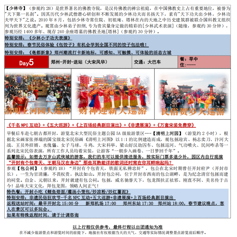(四)开封旅游注意事项: 开封的大部分景点都集中在一起,景点之间车程最多需要 20 分钟,并且景区都是平路,是这几天行程当中最轻松的一天!总体上来看这条线路是轻松愉悦的一条线路! 适合任何人群。